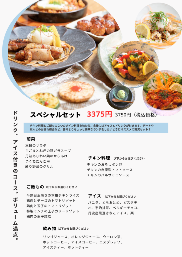 本日のサラダ / 鶏のから揚げ / 白ごまとねぎの鶏ガラスープ / つくねだんご串 / 彩り野菜のグリル / 選べるチキン料理(おろしポン酢 or トマトソース or バルサミコソース) / 選べるご飯もの(チーズと玉子のチキンライス or 特製ミンチのカリーリゾット or 鶏雑炊) / 選べるアイスクリーム(バニラ、とちおとめ、ピスタチオ、宇治抹茶、ベルギーチョコ、丹波産黒豆きなこアイス)