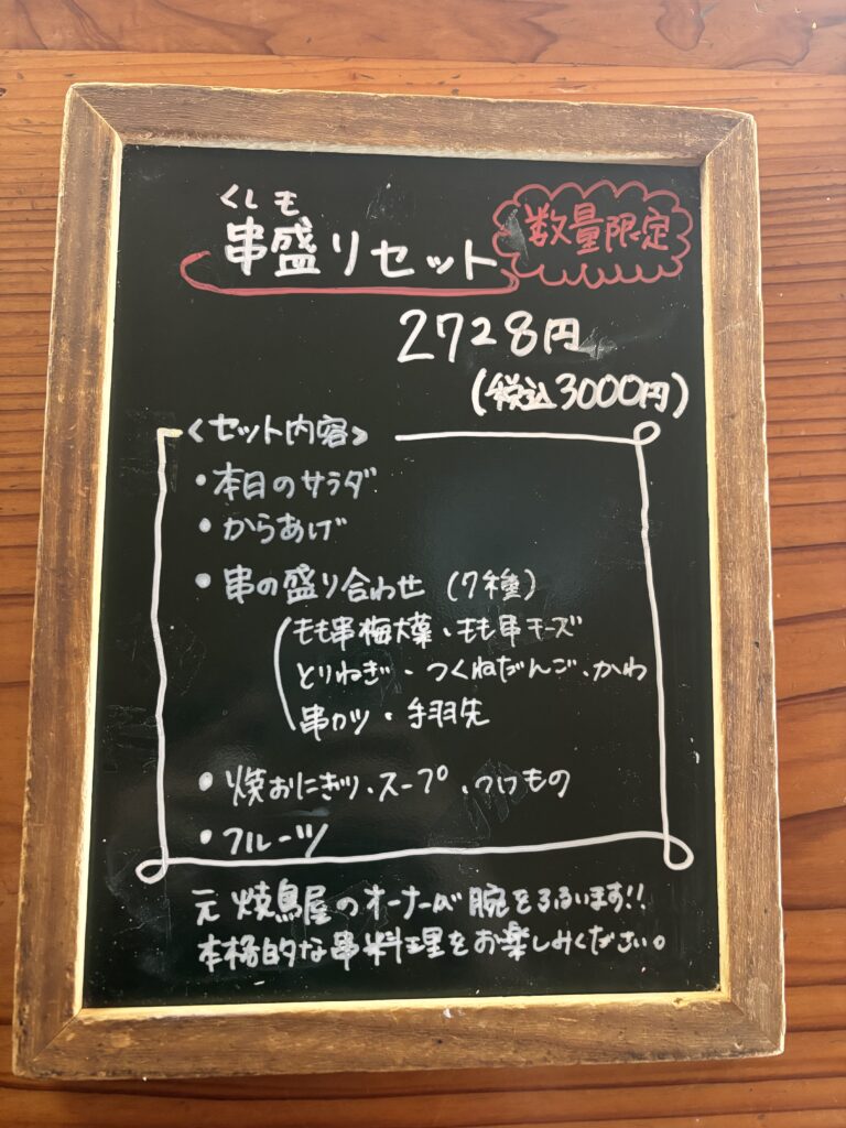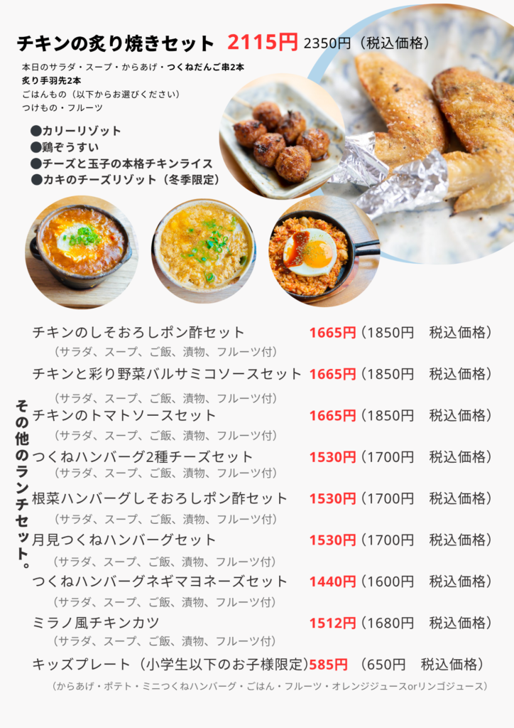 本日のサラダ / 鶏のから揚げ / 白ごまとねぎの鶏ガラスープ / つくねだんご串 / 炙り手羽先 / もも串3種盛り / 選べるご飯もの(チーズと玉子のチキンライス or 特製ミンチのカリーリゾット or 鶏雑炊) / 選べるアイスクリーム(バニラ、とちおとめ、ピスタチオ、宇治抹茶、ベルギーチョコ、丹波産黒豆きなこアイス)
